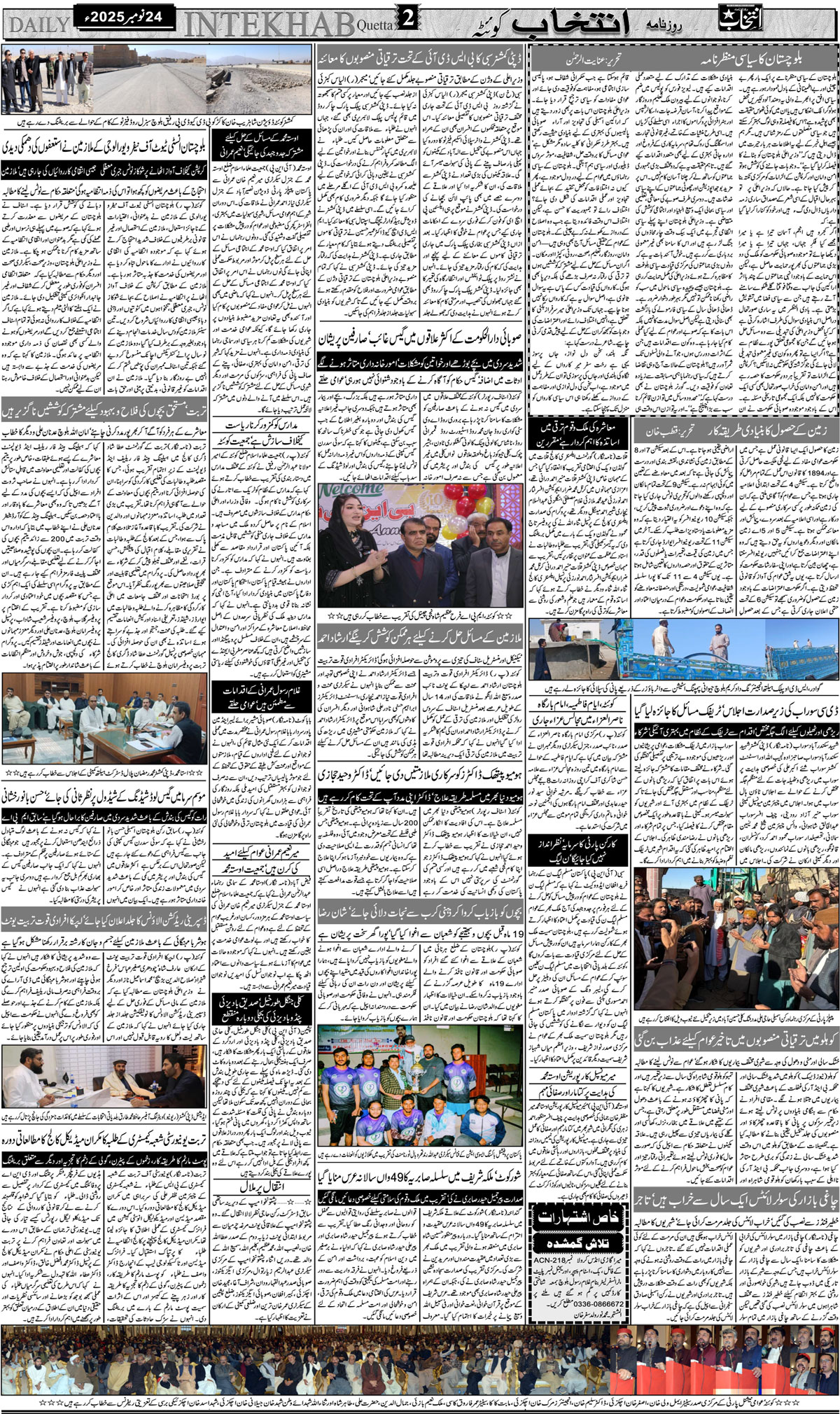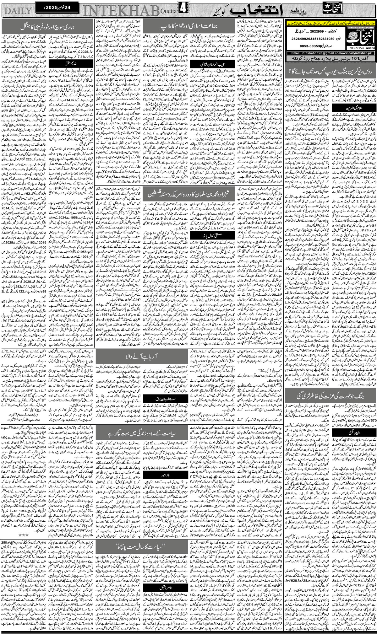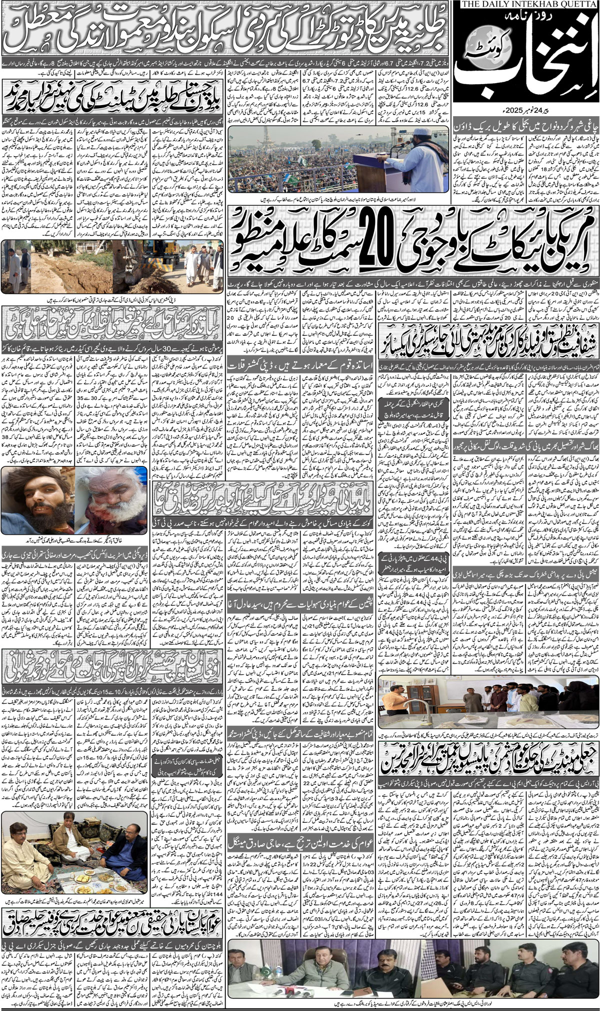 ریکوڈک مائننگ کمپنی کا مقامی خریداری کو وسعت دینے کے لیے نوکنڈی میں لوکل سپلائر آﺅٹ ریچ تقریب کا انعقاد متنازع ٹویٹ کیس، ایمان مزاری کے شوہر ہادی علی چٹھہ کے وکیل کا استغاثہ کے گواہوں سے جرح کرنے سے انکار امن کیلئے آواز اٹھانا اور حکومت کی غلط پالیسیوں پر سوالات کرنا کوئی جرم نہیں، انتقامی کارروائیاں بند کی جائیں، اے این پی آسٹریلوی سینیٹر کو پارلیمنٹ میں برقعہ پہن کر پابندی کے حق میں احتجاج کرنے پر ایک ہفتے کیلئے معطل کردیا گیا 26ویں اور 27 ویں آئینی ترامیم سے بعض اداروں کو ضرورت سے زیادہ اختیار مل جائیں گے، جو جمہوریت کیلئے خطرہ ہے، علی احمد کرد محکمہ صحت توسیع پروگرام ٹیکہ جات کی پوسٹوں پر بھرتی غیر مقامی افراد کو گرفتار کیا جائے، یوسی چیئرمین گونی گریشہ
