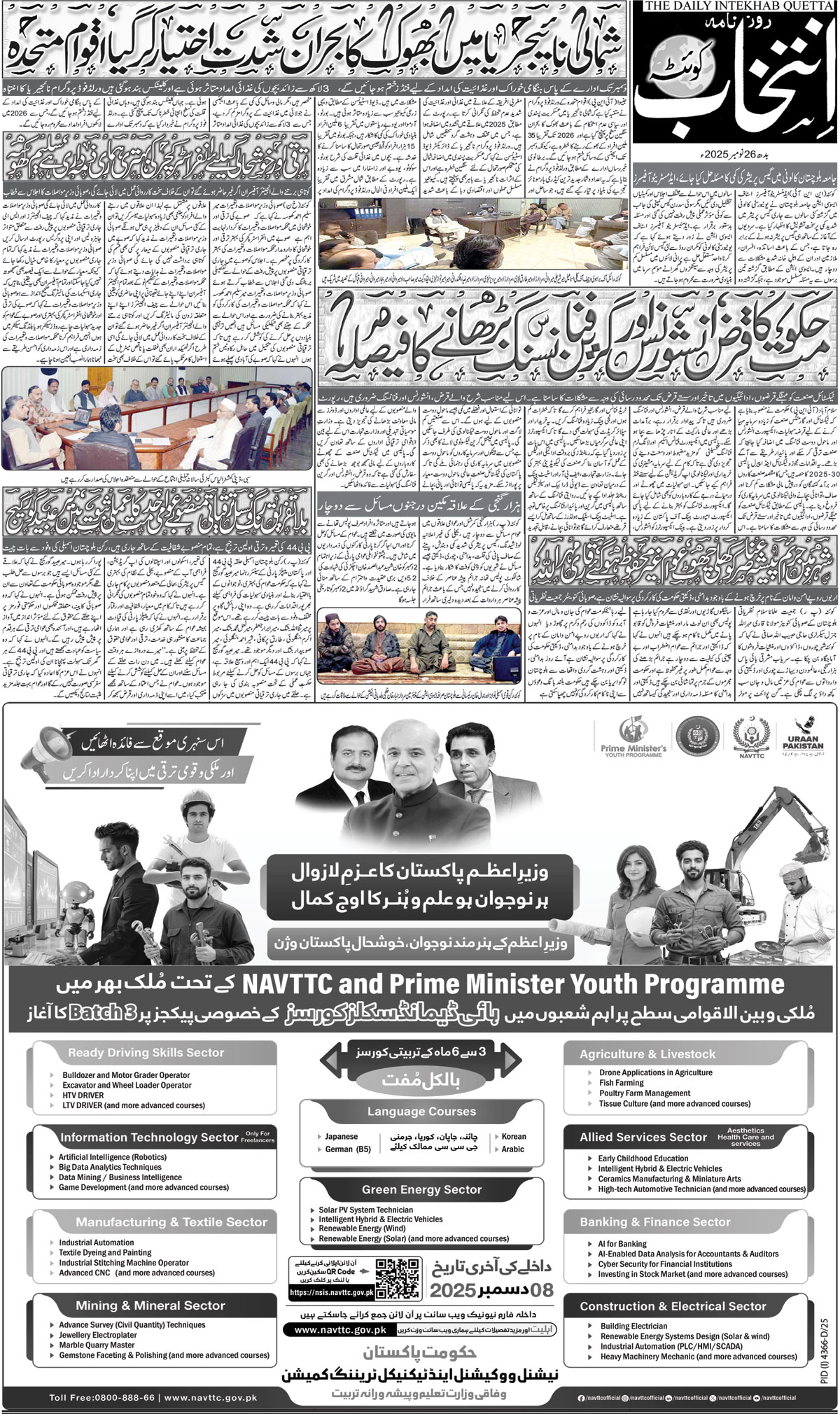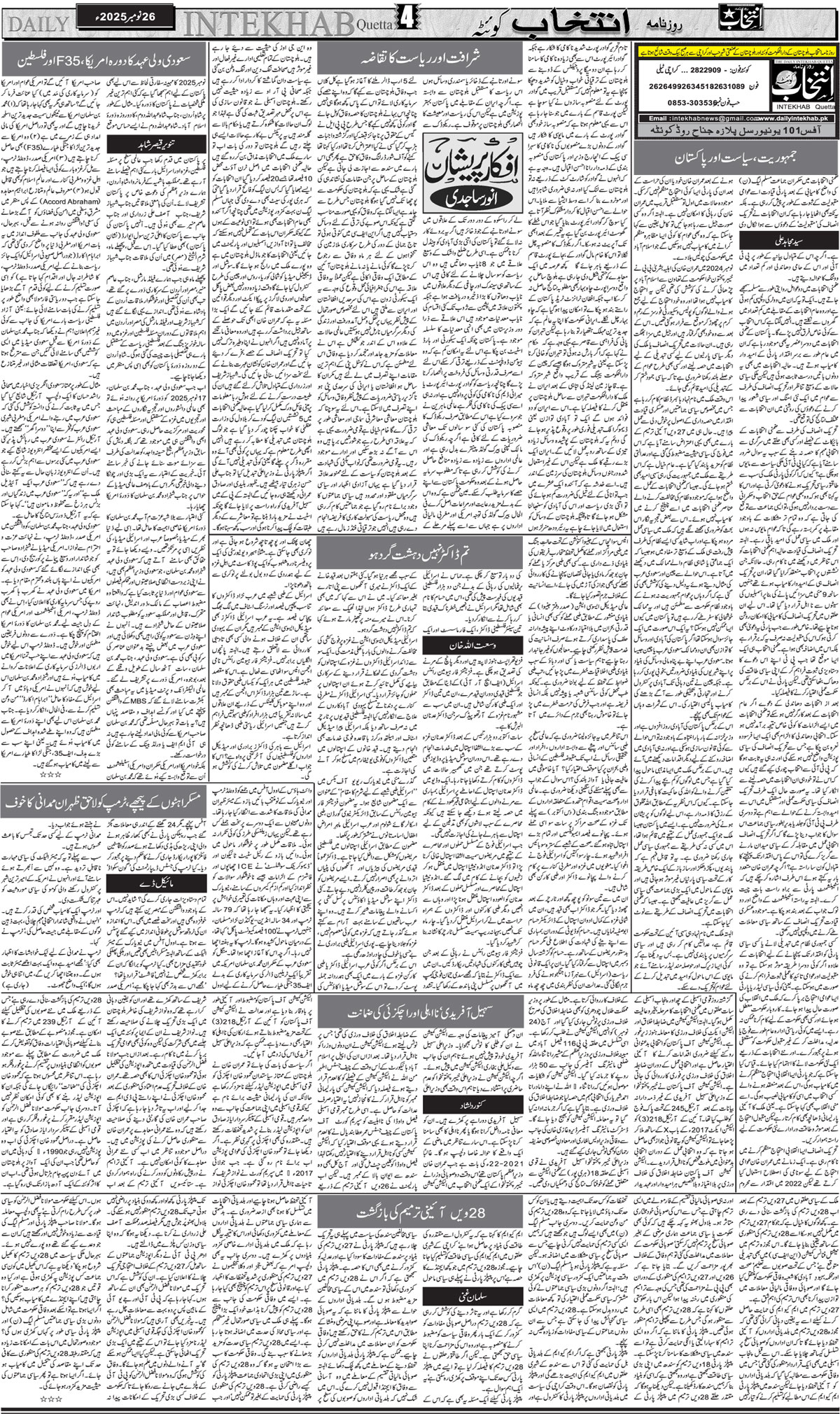 خاران میں این جی او کی گاڑی پر فائرنگ، بلوچستان کانسٹیبلری کے دو اہلکار زخمی، پولیس ذرائع امریکا اور ایران جنگ بندی پر متفق ہوگئے، دونوں ممالک کو اسلام آباد میں مذاکرات کی دعوت دیتا ہوں، شہباز شریف سبی، ایک شخص کی نعش برآمد ڈیجیٹل میڈیا پالیسی پرحکومت نے تمام اسٹیک ہولڈرز کو اعتماد میں نہیں لیا، بلوچستان ڈیلی نیوز پیپرز ایڈیٹر کونسل سلامتی کونسل میں آبنائے ہرمز کھلوانے کیلئے بحرین کی قرارداد کو روس اور چین نے ویٹو کردیا اسرار قلندرانی قتل کیس، وزیراعلی کی اسمبلی میں فاتحہ خوانی کی مخالفت